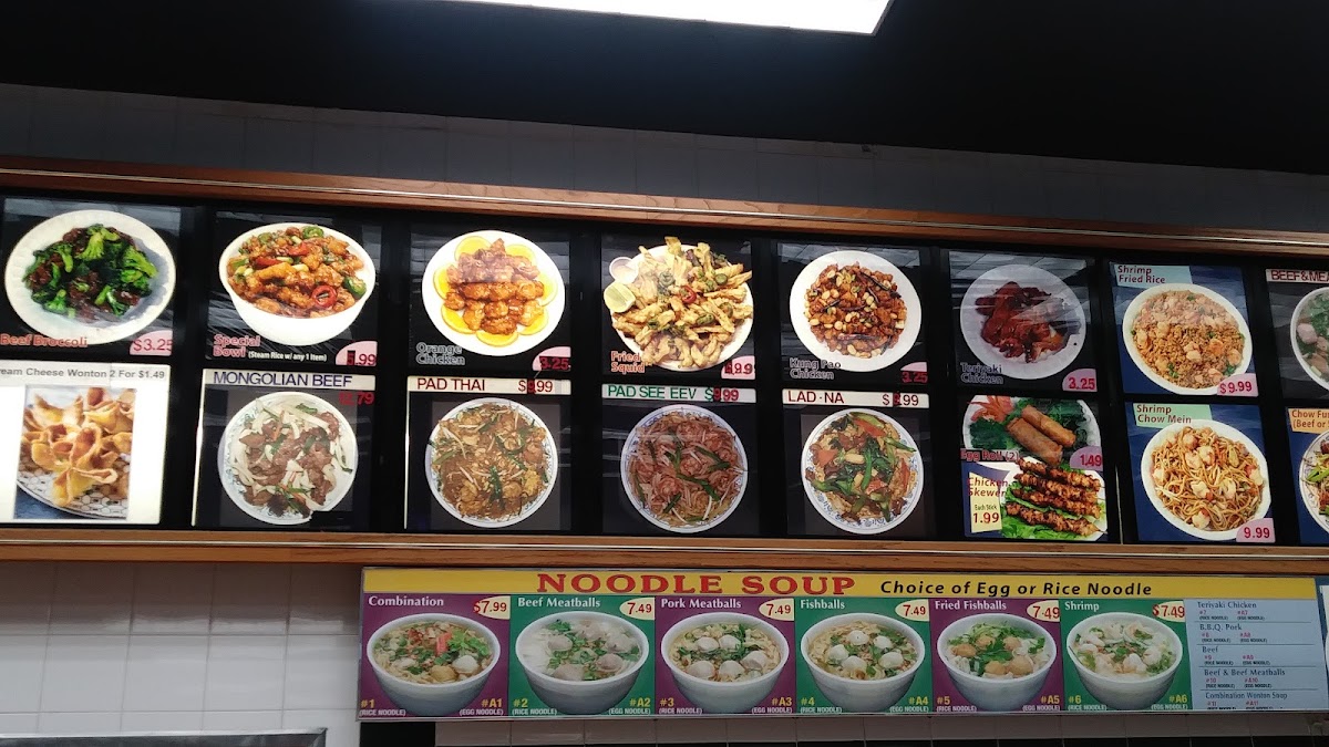 Fried rice or steam rice and chow mein and three entrees of your choice.