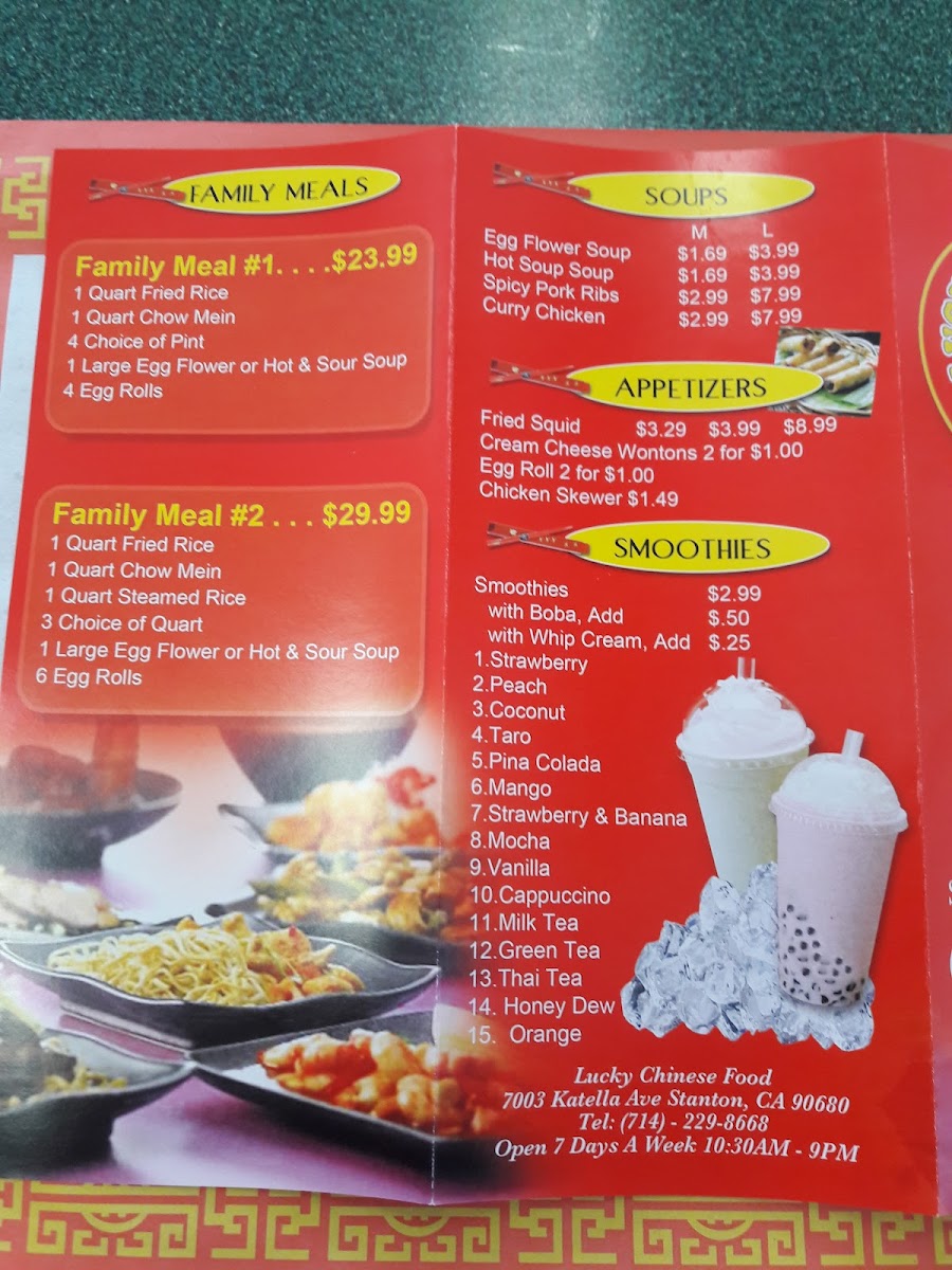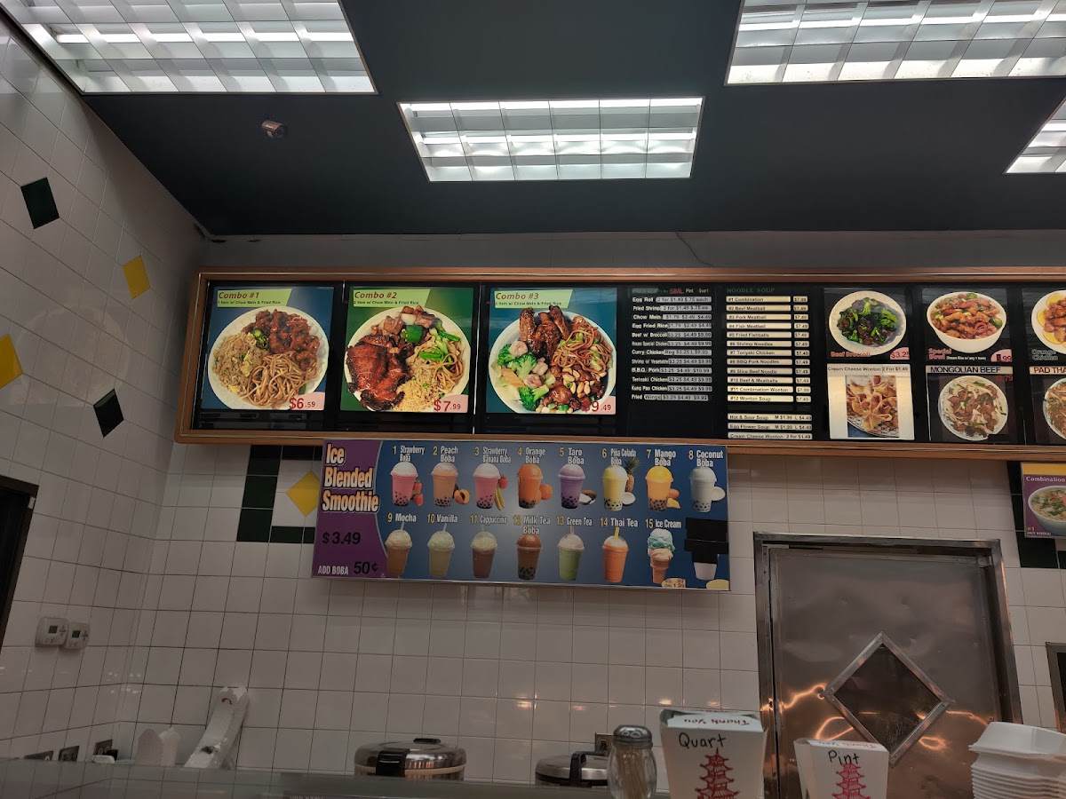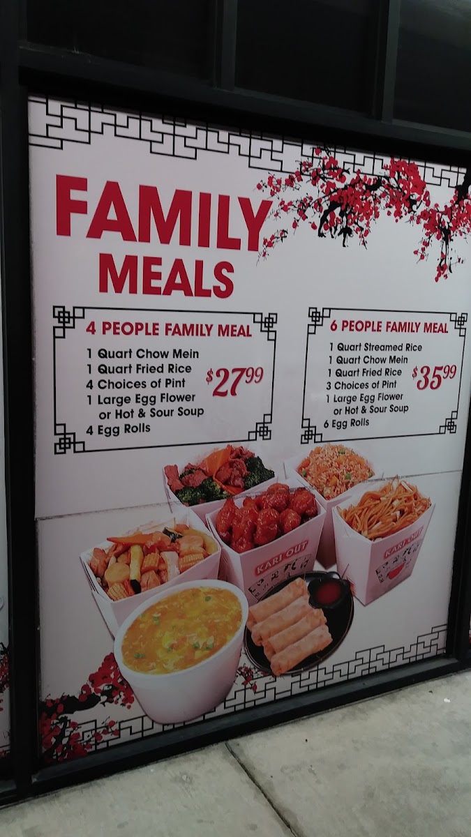 One quart fried rice, one-quart chow mein, one quart steamed rice, three choices of the quart, one large egg flower or hot and sour soup, six egg rolls. Please leave notes in special instruction if any changes.